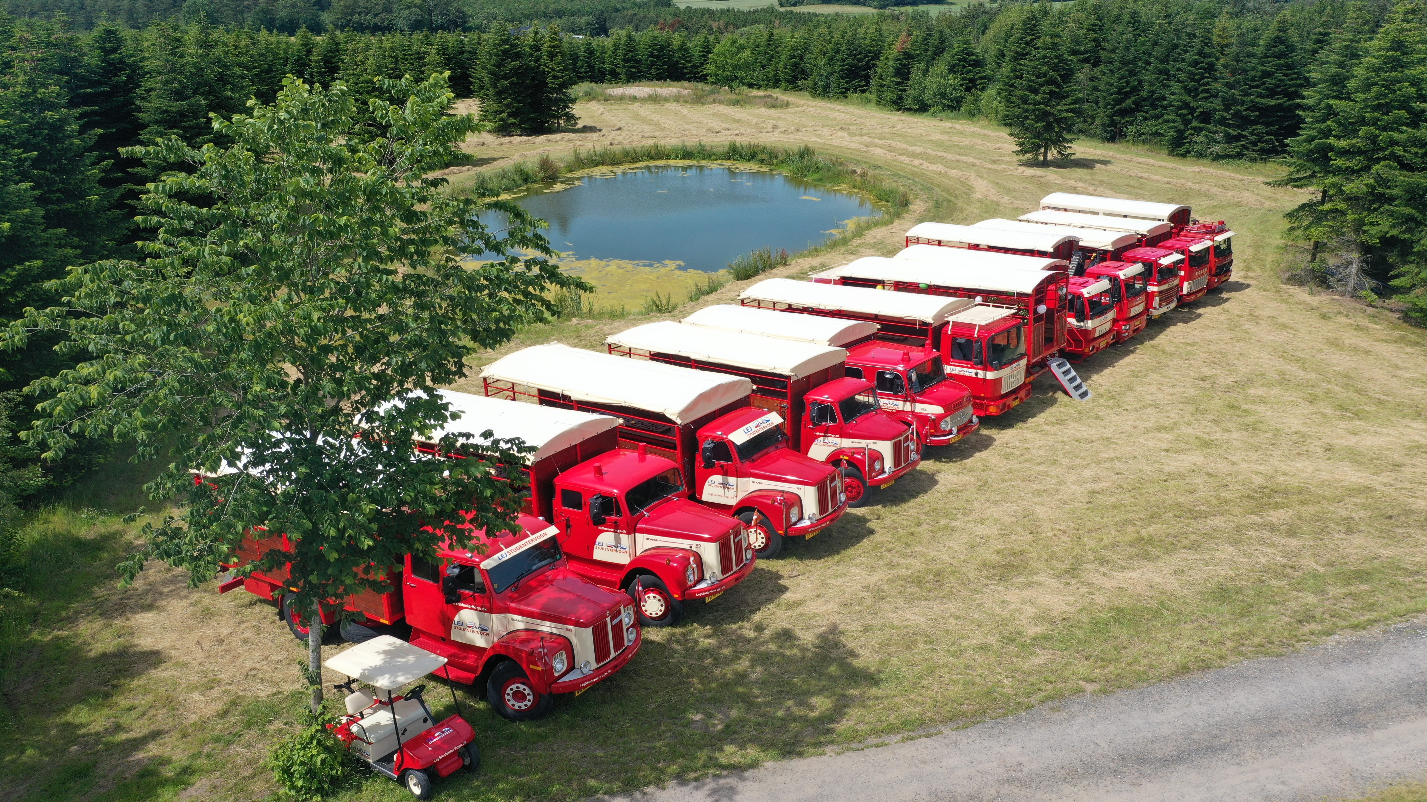 Vores vogne kan rumme op til 44 personer, men vi tilpasser de forskellige vogne, til antallet i netop jeres klasse. Ladet på alle vores vogne er ens, men det er ikke sikkert, at I får præcis samme førerhus som på billedet.